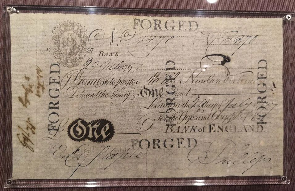 A counterfeit £1 note from 1797. Because they were new, people were unfamiliar with them and forgers took advantage of this (Bank of England Museum)